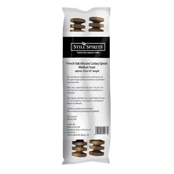 Infusion spirals provide simple and fast extraction of oak aroma and flavour at a fraction of the price of a barrel. They are also really easy to add to bottles or a carboy and remove afterwards, there is no need to filter out chips.