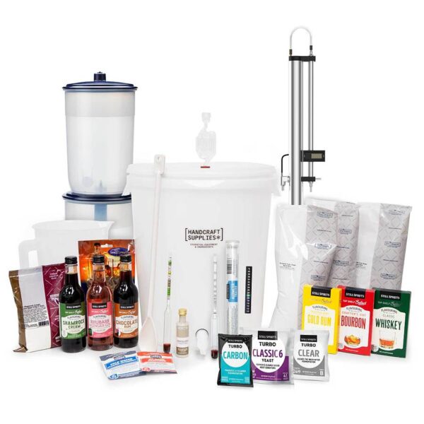 + Fermenter, mixing spoon, Turbo 6 yeast, 6kg’s of Turbo sugar, Turbo Carbon, and Turbo clear. You will also get a 5ltr mixing jug, Hydrometer, and a range of essences.